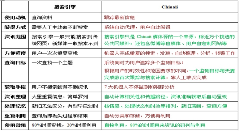 为用户的一个监测目标,Chinaii可能会定向搜索千万次;而通用搜索引擎为千万个用户的搜索提供相同的结果。