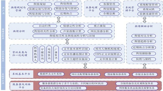 2、分析层:包括相关性分析、SOV计算、情感分析、自动归类等模块,以及辅助分析模块如传播趋势分析、传播对比分析、跟踪分析等;